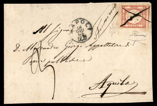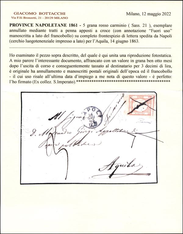 1861 - 5 grana rosso carminio (21) - perfetto - su frontespizio completo di lettera da Napoli 14 GIU 63 a L'Aquila - Il francobollo utilizzato ben otto mesi dopo la fine della sua validità postale è annullato con tratti di penna a croce con annotazione manoscritta al lato del francobollo "Fuori uso" - cert. Bottacchi