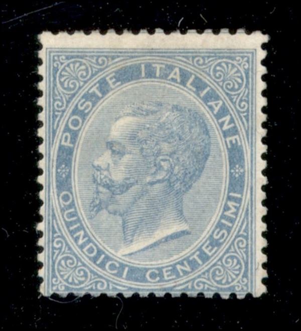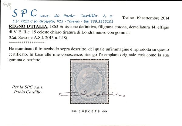 1863 - 15 cent VE II celeste chiaro (L18 cat.1625) - nuovo con gomma originale - bello e fresco - cert. Cardillo