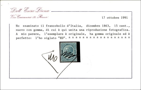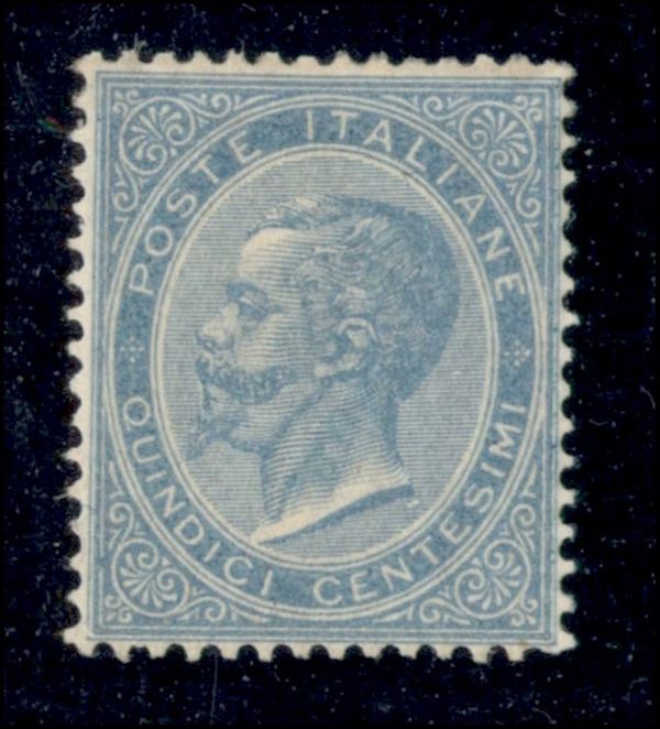 1863 - 15 cent VE II celeste chiaro (L18 cat.4750) - nuovo con gomma originale - fresco e ben centrato - cert. Enzo Diena