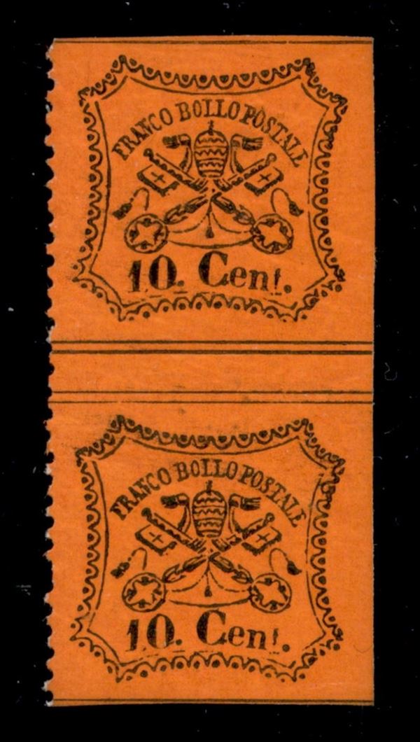1868 - Coppia verticale del 10 cent vermiglio (26ga cat.900) con interspazio di gruppo dentellata solo a sinistra - gomma integra - SPL