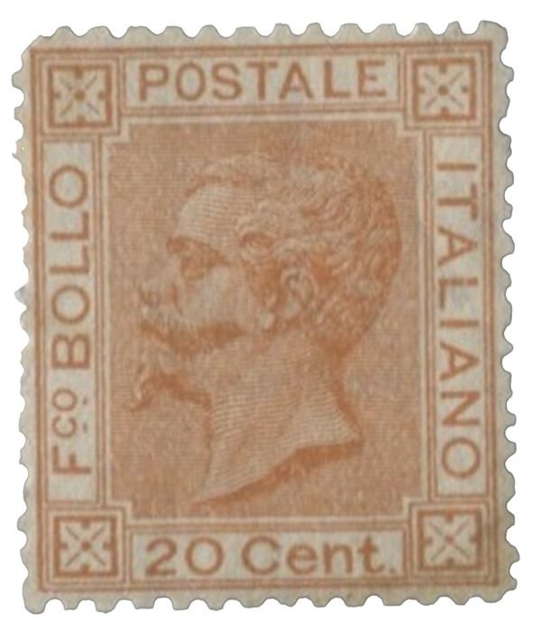 1877 Regno - Vittorio Emanuele 20 cent ocra arancio - esemplare con angolo arrotondato - cert. ED - (28)