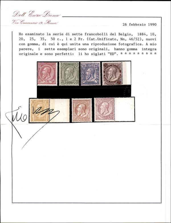 1884 - Re Leopoldo II (46/52) - serie completa - carta colorata al recto - gomma integra - cert. Diena