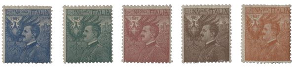 1906 Regno - Prove ritratto di Vittorio Emanuele III° con il volto a sinistra - cinque valori con colori diversi - cert. Carraro - (79N)