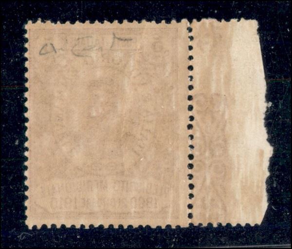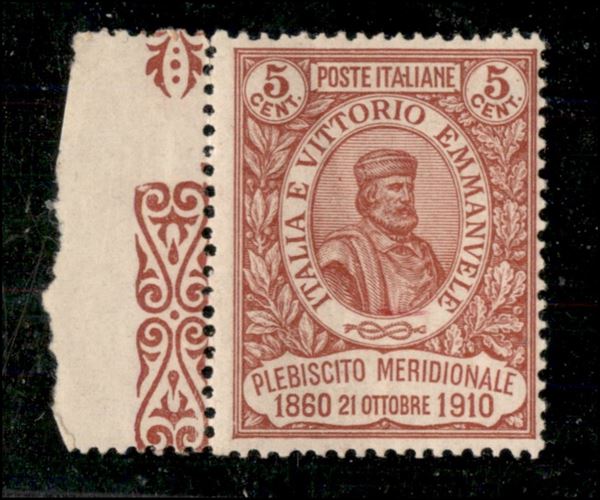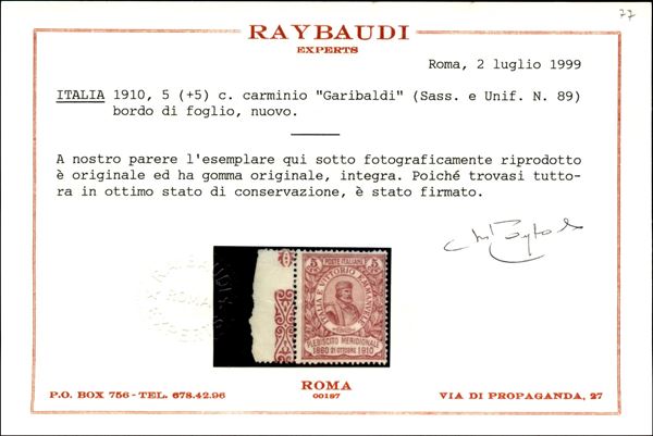 1910 - 5 cent carminio Garibaldi (89) bordo di foglio - gomma integra - cert. Raybaudi