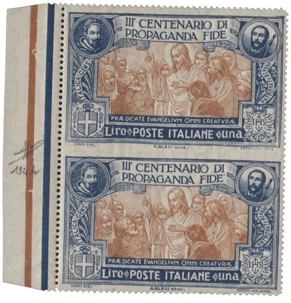 1923 Regno - Propaganda Fide 1 lira azzurra e arancio - coppia verticale non dentellata in mezzo - cert. Sorani - (134h)