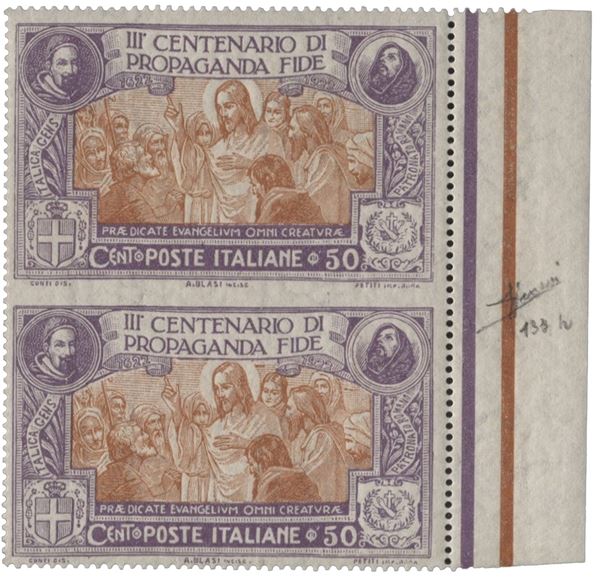 1923 Regno - Propaganda Fide 50 cent violetto e arancio - coppia verticale non dentellata in mezzo - cert. Sorani - (133f)