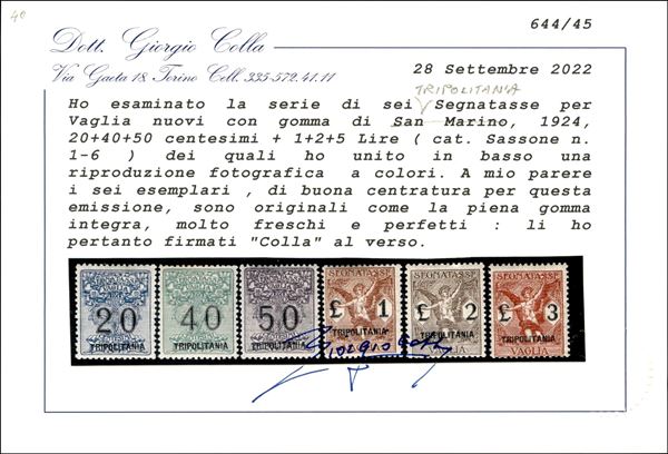 1924 - Segnatasse Vaglia (1/6) - serie completa - gomma integra - cert. Colla