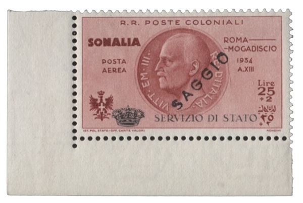 1934 Colonie Italiane - Somalia Servizio Aereo Coroncina 25 lire + 2 lire soprastampata Saggio - splendida con angolo di foglio - (S.A. 1)