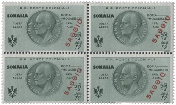 1934 Colonie Italiane - Somalia volo Roma Mogadiscio - serie di dieci valori in quartina soprastampati Saggio - splendida - (A 7/16)