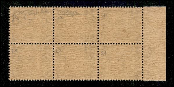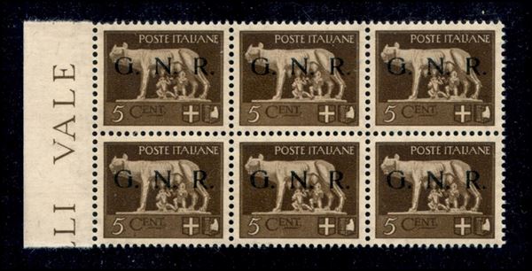 1943 - 5 cent (470/A) - blocco di 6 bordo foglio (posiz. 11/23) - gomma integra - ottimamente centrato - Raybaudi