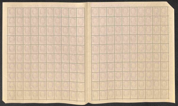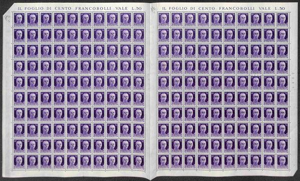 1943 - 50 cent (477/I-seconda tiratura - CEI 8/I) - foglio doppio di 200 pezzi con interspazi al centro e tutti gli errori di composizione - gomma integra - rarissimo insieme probabilmente unico