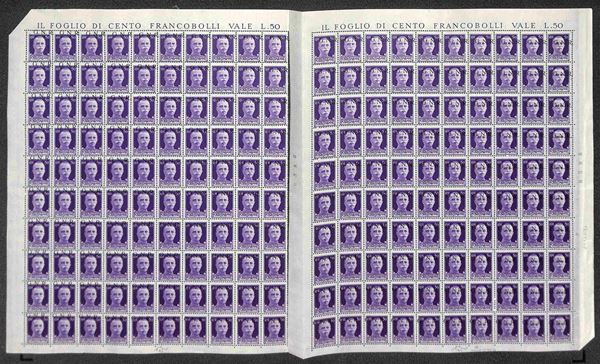1943 - 50 cent Imperiale (477/Ia varietà d) - Intero foglio di 200 pezzi con soprastampa obliqua e spostata in alto più tutte le varietà di composizione - interspazio al centro - gomma integra - unico e rarissimo - firma Chiavarello