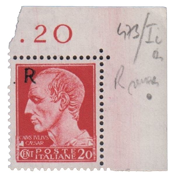 1943 - GNR Brescia - 20 cent con soprastampa in alto e N a cavallo pił R senza punto (errore ia) - angolo di foglio - gomma originale integra - (473/Ii)