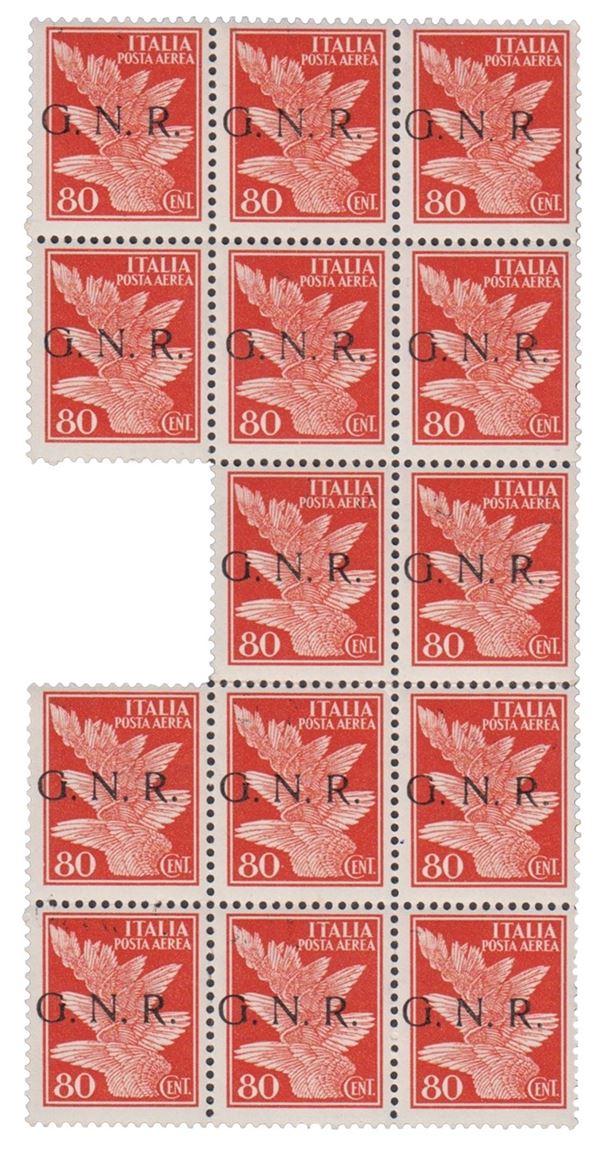 1943 - GNR Brescia - Blocco di 14 esemplari (pos. 8/50 manca 28) del 80 cent con R senza punto (errore i) + R punto grosso (errore iab) - gomma originale integra - (120/I)