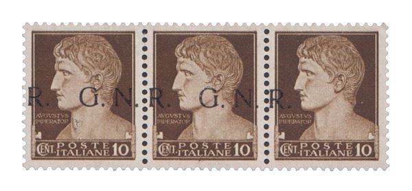 1943 - GNR Brescia - striscia di tre del 10 cent con soprastampa spostata R GN + solo R - gomma originale integra - cert. Avi - (CEI 2/Ie)