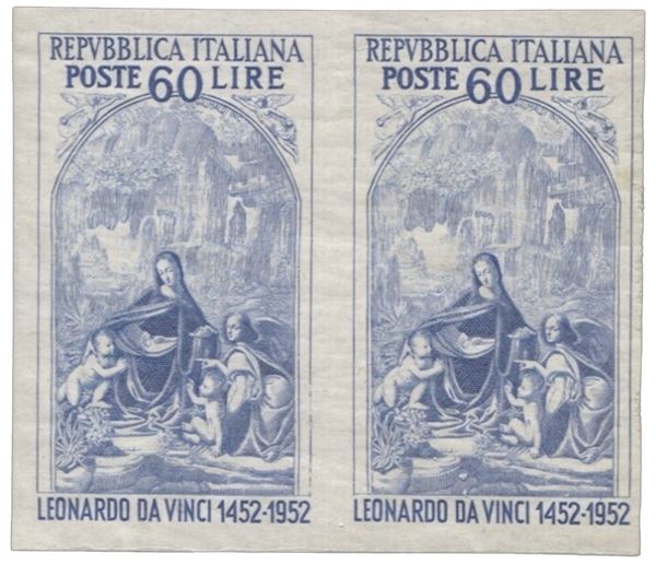 1952 Repubblica - 60 lire Leonardo da Vinci coppia orizzontale non dentellata - cert. ED - (687b)