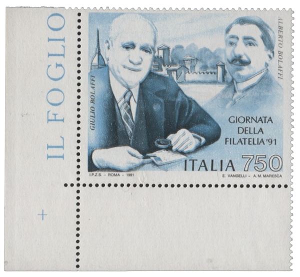 1991 Repubblica - 750 lire Giornata della Filatelia con la sola stampa del colore azzurro - francobollo con angolo di foglio - cert. oro Raybaudi - (Specializzato 1612 Aa)