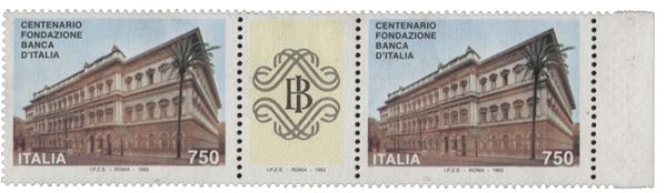 1993 Repubblica - 750 lire + 750 lire Centenario della Fondazione della Banca d'Italia senza la stampa del colore rosso - cert. Carraro - (Bolaffi 2202 B)