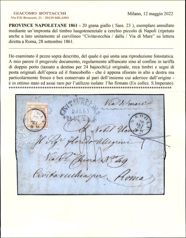 20 grana giallo (23) molto fresco leggermente sfiorato in alto a destra isolato su lettera da Napoli 28 SET 61 a Roma con bollo della via di mare di Civitavecchia - tassata 24 bajocchi - Uso isolato estremamente raro di ottimo aspetto - Firma Chiavarello + cert. Bottacchi