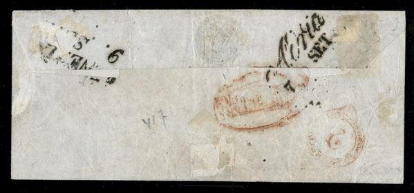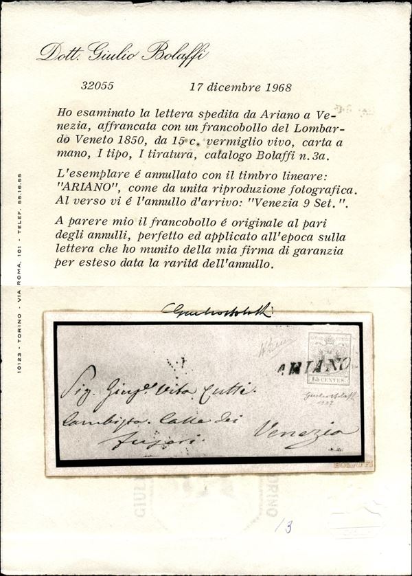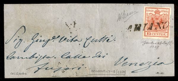 Ariano (stampatello diritto - P.ti 13) su lettera del 7.9.1850 per Venezia affrancata con 15 cent (3a) carta a mano primo tipo prima tiratura - firma A. Diena + cert. Bolaffi