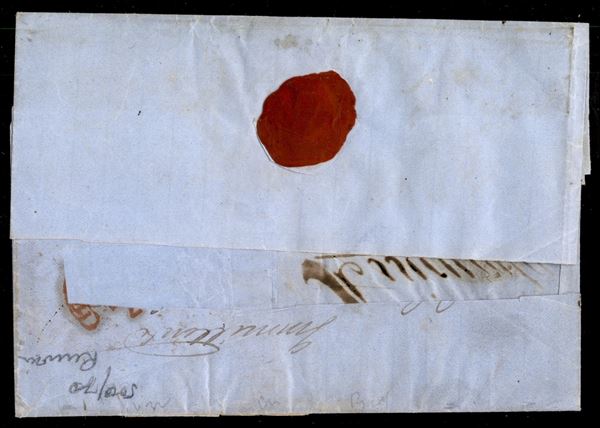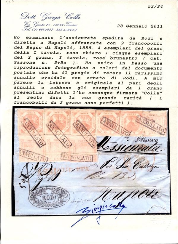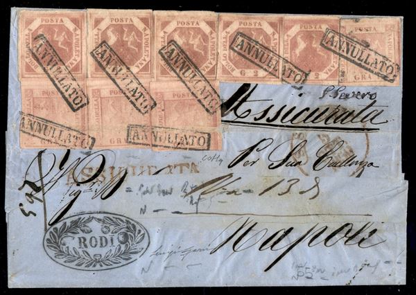 Assicurata da Rodi per Napoli affrancata con quattro esemplari del 1 grano rosa chiaro I tavola + cinque esemplari del 2 grana rosa brunastro I tavola (3 + 5c cat.25000+) - sicuramente la lettera pił importante con il raro annullo ovoidale ornato di Rodi - cert. Colla