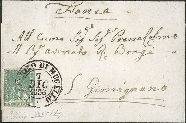 Barberino di Mugello (doppio cerchio P.ti R1) - 2 crazie azzurro grigio verdastro (13a) su lettera per S. Gimignano del 7.12.58 - Oliva + cert. Colla