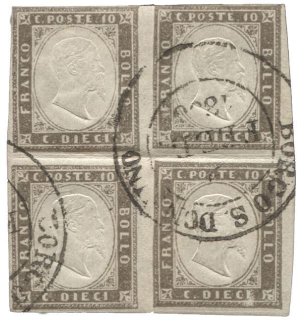 Blocco di quattro del 10 cent grigio brunastro - Borgo S. Donnino - PROBABILMENTE UNICO - Em.D + Oliva + ED + cert. Raubaudi - (14Ae)
