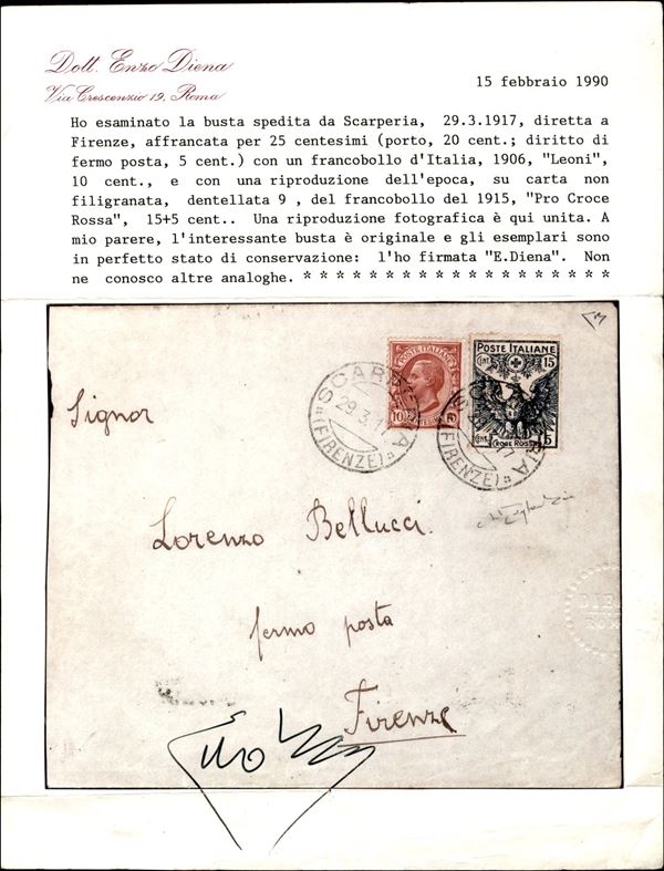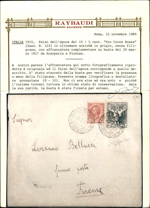 Busta viaggiata da Scarperia 29.3.17 per Firenze affrancata con 10 cent Leoni pił Falso dell'epoca del 15 + 5 cent Pro Croce Rossa (82 + F103) - pezzo probabilmente unico - cert. Raybaudi + E. Diena