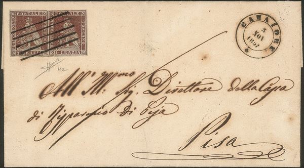 Camaiore (muto a 5 sbarre P.ti R2) - coppia del 1 crazia carminio bruno su grigio (4e) su lettera per Pisa del 5.11.57 - cert. Sorani