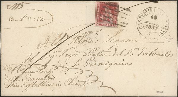 Castellina in Chianti (doppio cerchio grande) + annullo muto a 5 sbarre di Siena (P.ti R3+) - quest'ultimo apposto in transito su 1 crazia (4) su lettera assicurata (con denaro) per S. Gimignano del 30.7.58 - molto bella - Bolaffi + cert. Diena