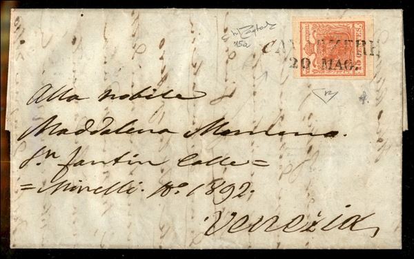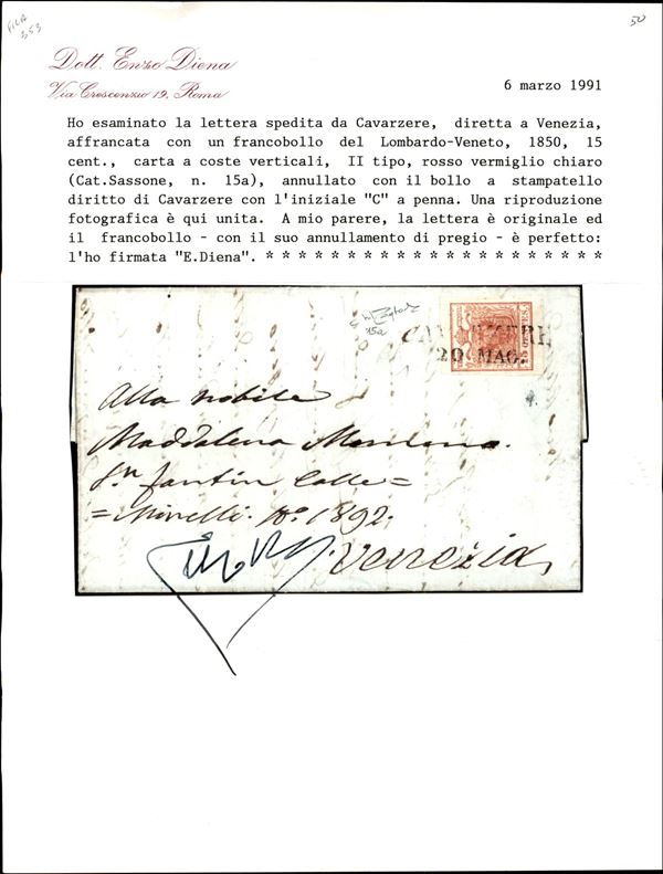 Cavarzere (stampatello dritto - P.ti 7) - lettera del 20.5 per Venezia affrancata con 15 cent Secondo tipo carta a coste verticali (15a) - cert. E. Diena