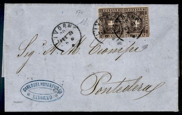 Circolare affrancata con coppia orizzontale del 1 cent violetto scuro (17c cat.9000) da Livorno 20 FEB.61 per Pontedera - firma AD