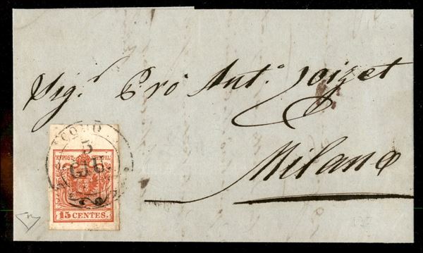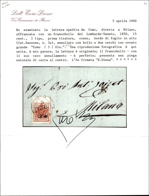 Como (doppio cerchio grande - P.ti 12) - lettera del 3.6.1850 terzo giorno d'uso per Milano affrancata con 15 cent carta a mano primo tipo prima tiratura bordo di foglio (3a) - cert. E. Diena