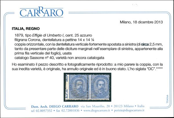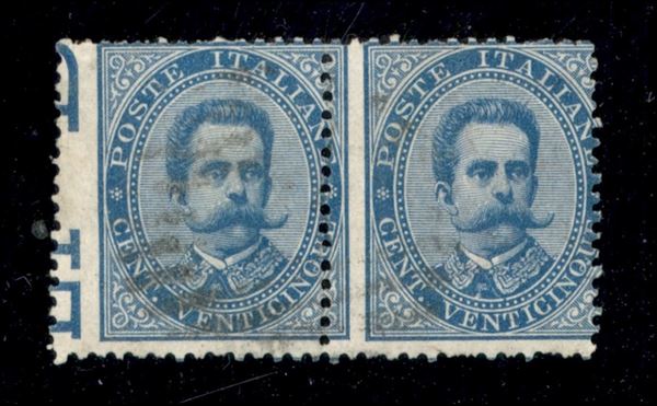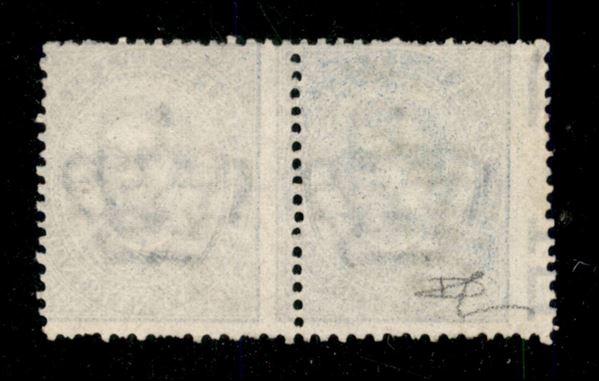 Coppia orizzontale del 25 cent (40h/ha) usata con dentellatura verticale fortemente spostata a sinistra e con il primo es. con diciture marginali parzialmente all'interno del francobollo - cert. Carraro