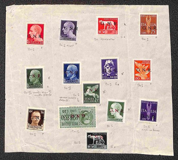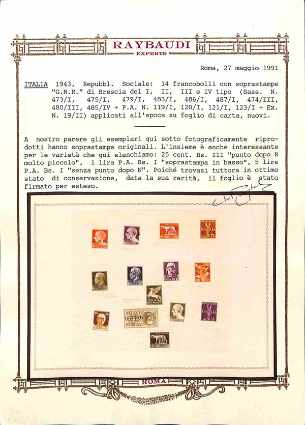 Foglietto con applicati 14 valori dell'Imperiale come consueto all'epoca e predisposti all'uso con soprastampe diverse (Tiratura di prova 485A+474/IIIe+480/III + Primo tipo 473/I+475/I varietāfd+479/Ihb+483Ipc+487+Aerea 120/Id+121db+123h+Espressi 19II) - insieme unico - cert Raybaudi