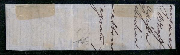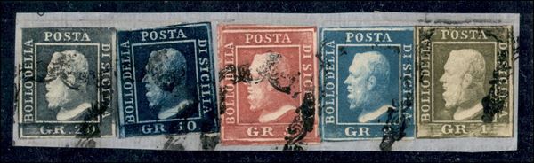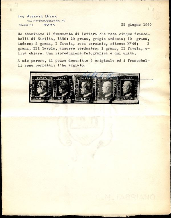 Frammento con affrancatura pentacolore composta da 20 grana grigio ardesia + 10 grana indaco + 5 grana rosa carminio I tavola ritocco 46 + 2 grana azzurro verdastro III tavola + 1 grano oliva chiaro II tavola (13 + 12b + 9 rit.46 + 8b + 4) con margini da buoni a ottimi - cert. Alberto Diena