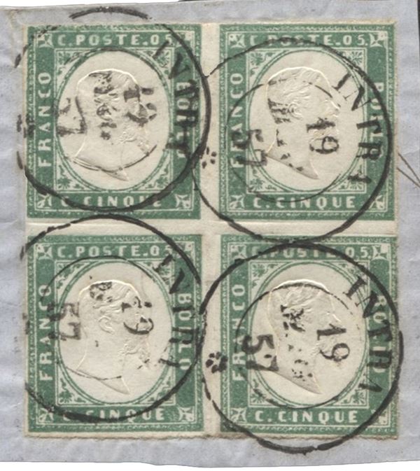 Frammento con blocco di quattro del 5 cent verde smeraldo - Intra 19.5.57 in D.C. - rarità - AD + Oliva + cert. Sorani - (13D)