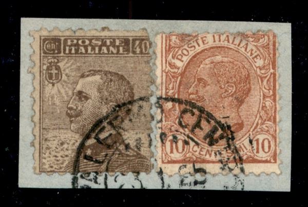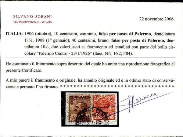 Frammento recante due falsi dell'epoca da 40 + 10 cent (F82 + F84) - Palermo 23.1.26 - cert. Sorani