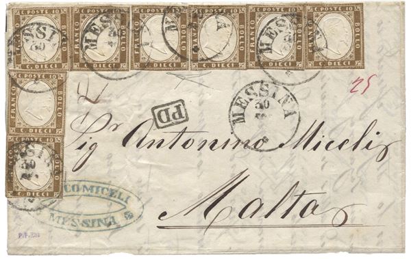 Fresca lettera da Messina per Malts affrancata con otto es. taglio lilliput del 10 cent bistro oliva scuro - monocolore multipla d'effetto e rarità - Bottacchi - (14Da)