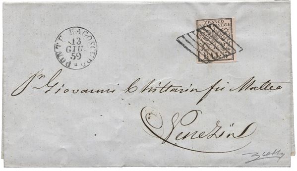 Fresca lettera da Pontelagoscuro 13.6.59 per Venezia affrancata con 5 baj bene marginato - secondo giorno d'uso del Pontificio in Governo Provvisorio delle Romagne - cert. Colla - (6)