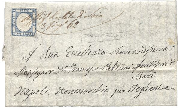 Fresca lettera del 3.6.62 affrancata con 2 grana con angolo difettoso in basso a destra annullato a penna Uffizio Postale di Noia (P.ti R2) - di notevole rarità - AD + Sottoriva - (20)