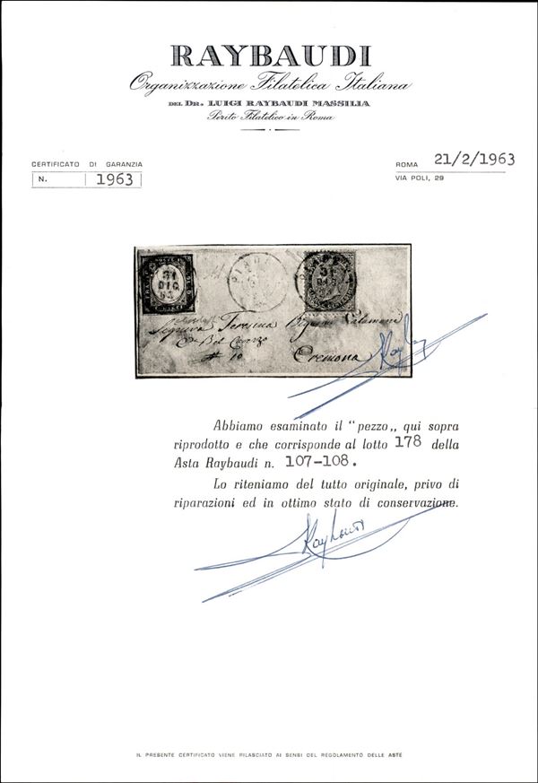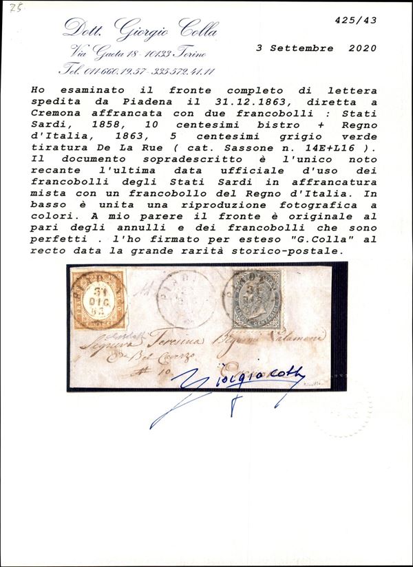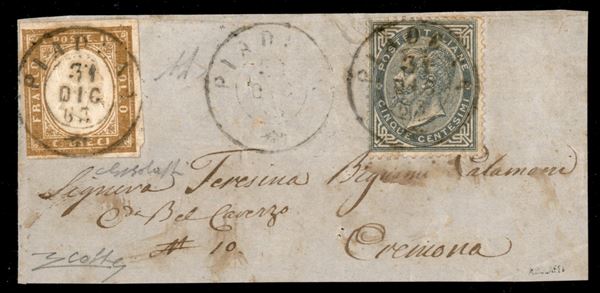 Fronte di lettera recante un 10 cent Sardegna + 5 cent DLR (14E + L16) - Piadena 31.12.63 (ultimo giorno d'uso ufficiale dei francobolli sardi) - unica mista nota - firma Bolaffi + A. Diena + cert. Raybaudi + cert. Colla
