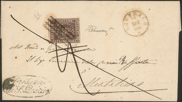 Governo Provvisorio - S. Quirico (doppio cerchio) + muto a 4 sbarre (P.ti R1) su 10 cent (19) - lettera per Montalcino del 23.11.60 non affrancata in partenza e quindi tassata ma poi detassata dopo la regolare affrancatura - Vaccari + cert. Diena