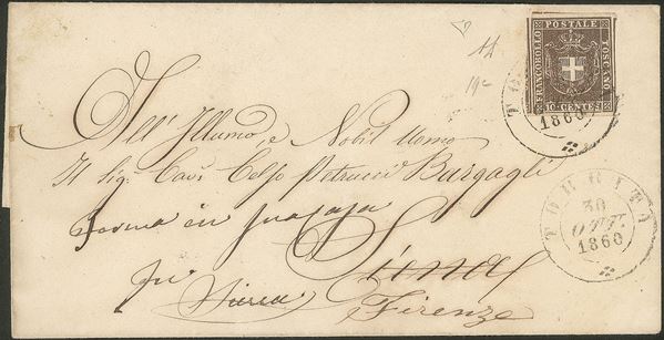 Governo Provvisorio - Torrita (doppio cerchio grande P.ti 12) su 10 cent bruno grigio (19c) ripetuto a lato di lettera per Siena poi proseguita per Firenze del 30.10.60 - Diena