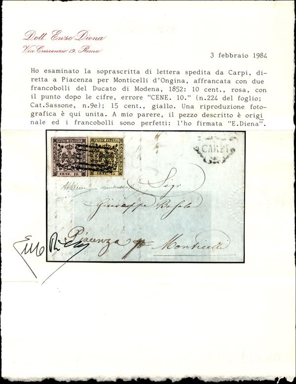 Gran parte di lettera da Carpi affrancata con 10 cent errore CENE + 15 cent (9e + 3) - ottimi margini - firma A. Diena + Bolaffi + cert. E. Diena