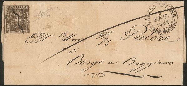 Lastra a Signa (doppio cerchio) + annullo con tratto a penna (P.ti R2) - 10 cent (19g) con linea di riquadro verticale a sinistra - lettera per Borgo a Buggiano del 9.9.61 - probabile frode postale in quanto il 10 cent presenta traccia di precedente annullo - molto bella - Diena + cert. Sorani