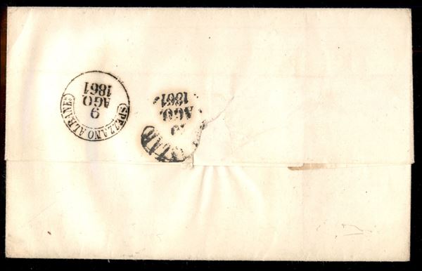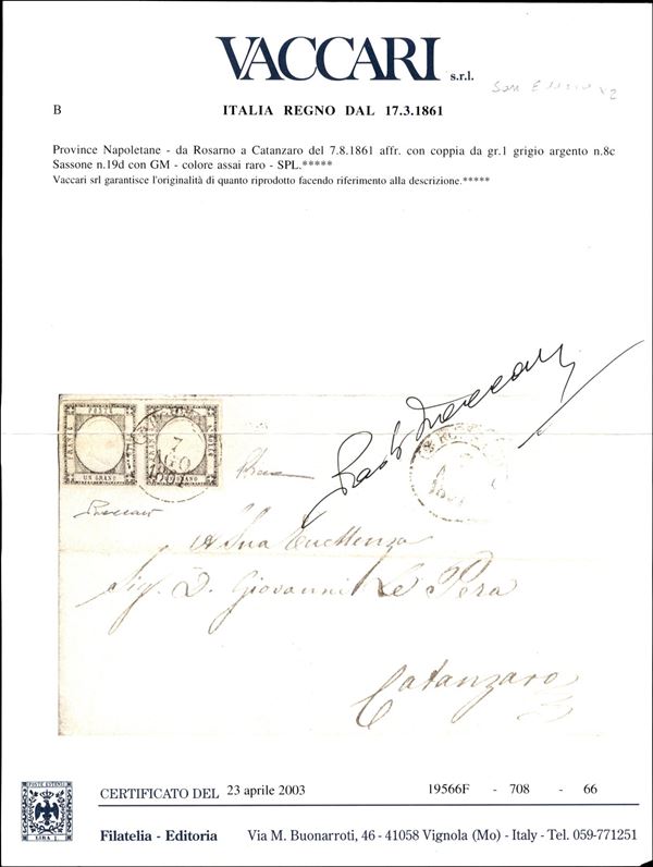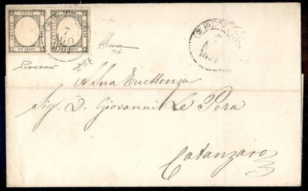 Lettera affrancata con coppia orizzontale del 1 grano grigio argento (19d) perfetta e ben marginata da Rossano 7 AGO.1861 a Catanzaro - gradazione di colore molto rara di splendida qualità - cert. P.Vaccari