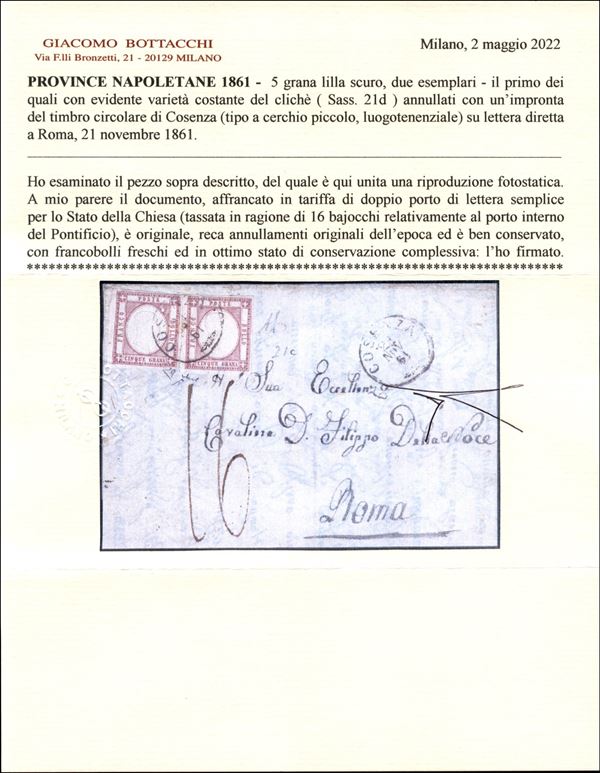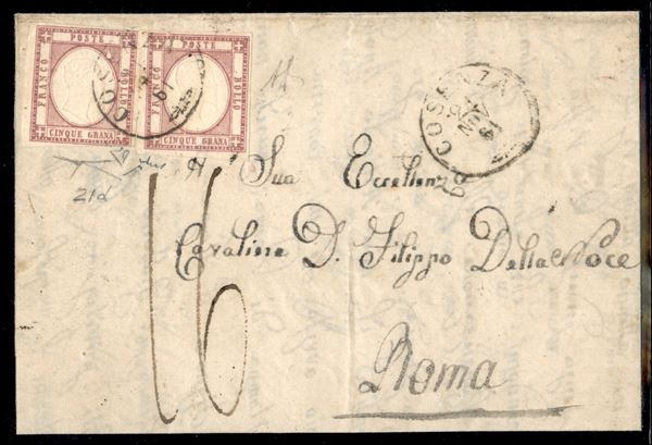 Lettera affrancata con due esemplari del 5 grana lilla scuro (21d cat.6500+) da Cosenza 21 NOV 61 per Roma - tassata 16 bajocchi relativi al porto interno Pontificio - ottimo stato di conservazione - cert. Bottacchi