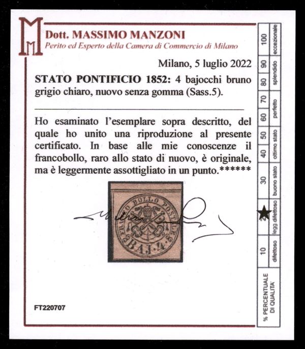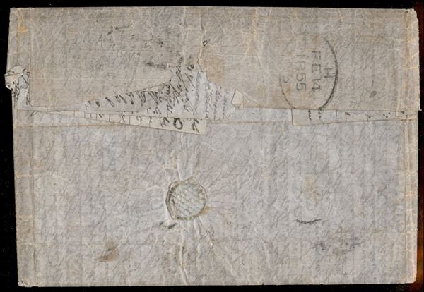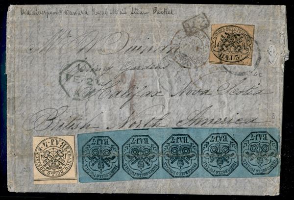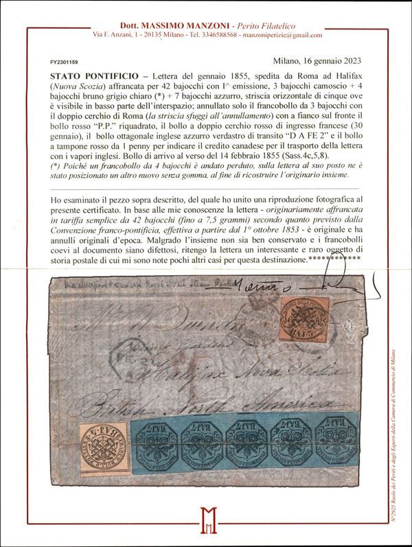 Lettera affrancata per 42 bajocchi composta da un 3 baj camoscio (4c) + 4 baj (applicato nuovo senza gomma per ricostruire l'originale affrancatura andata perduta) + striscia di cinque esemplari del 7 baj azzurro (sfuggita all'annullamento) - Partita da Roma nel gennaio 1855 ed arrivata ad Halifax (Nuova Scozia) il 14 febbraio 1855 - bollo d'ingresso in Francia del 30 gennaio + bollo inglese in azzurro verdastro per il transito del 2 febbraio e bollo a tampone da 1 penny per il credito canadese da riscuotere per il trasporto con i vapori inglesi - difetti ma una delle pochissime lettre note per questa destinazione - cert. Manzoni