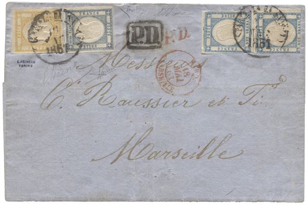 Lettera da Napoli 17.5.61 per la Francia affrancata con 2 es. (1 dif.) del 2 + 20 e 50 gr. ardesia oltremare - un 2 gr. con filetto esterno di quadratura in alto e 50 gr. con doppia effige a rilievo con grandi margini - Tricolore di ECCEZIONALE RARITA' - Em.D + Sorani + cert. ED fotocopia + cert. RD - (20b + 23a + 24d)